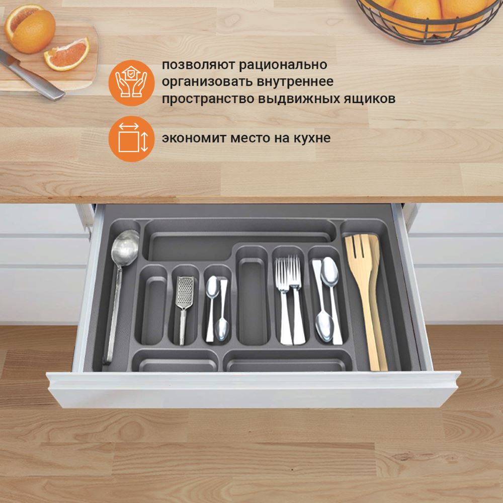 Лотки для столовых приборов EVA позволяют рационально организовать внутреннее пространство выдвижных ящиков. Цвета: серый и белый глянец. Для ящиков 800 мм.