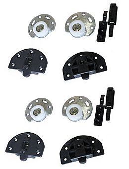 - Система включает в себя комплект на две двери: верхний пластмассовый направляющий ригель с пружиной (4шт), нижние подшипниковые колеса с полиамидным покрытием (4шт), стопор (4шт).