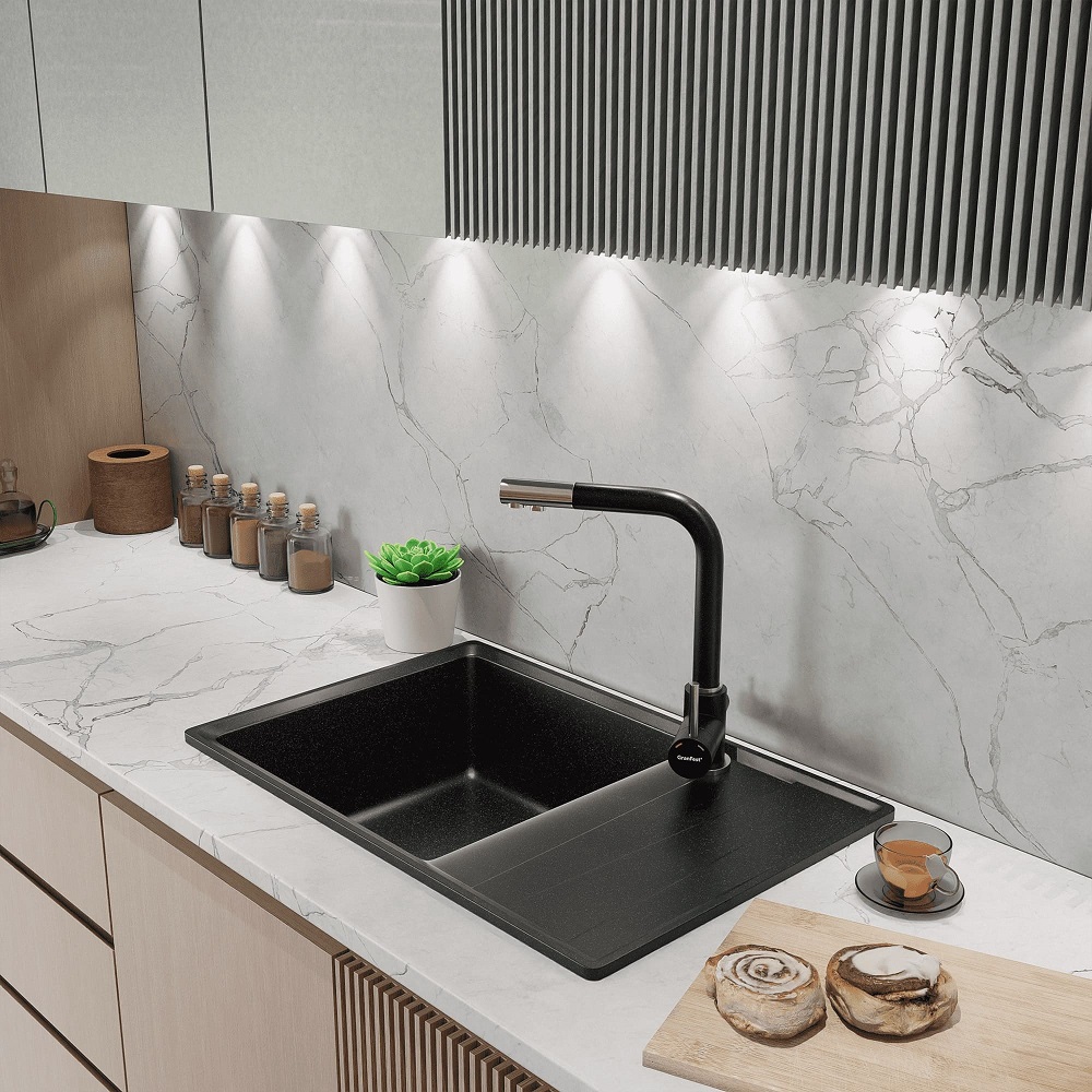 Мойка для кухни GranFest GF-LV-760L - благодаря продуманной эргономике и оригинальному дизайнерскому решению крыла ее можно установить в шкаф шириной 600 мм. Дизайнерскую модель отличают большая практичная чаша размером 450*440 мм, и глубиной 200 мм, которая с легкостью позволит разместить внутри крупногабаритную посуду и промывать ее без лишних усилий. Игра плоскостей на функциональном крыле помогает удобно расположить уже вымытую посуду, чтобы с нее стекала вода. Броская, оригинальная коллекция LEVEL выполнена в очень запоминающейся стилистике, которую во многом поддерживает необычный 3d рельеф на крыле. Трёхмерный рисунок похож на плавно перетекающие друг в друга ступени.