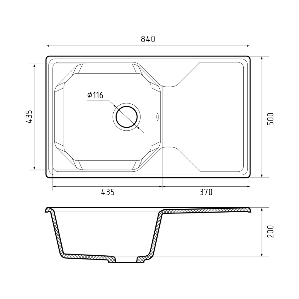 Разрабатывая модель GF-U-840L, дизайнерское бюро GranFest делало ставку на эргономику. Мы создали практичный дизайн, который удобен в уходе. За счет скошенных, не острых углов, и стойкому защитному покрытию ухаживать за такой чашей одно удовольствие. Мойка для кухни подходит как для просторной кухни, так и небольшой и устанавливается в шкаф шириной 500 мм. Хочется обратить внимание на местоположение установки смесителя. Его можно расположить в любой из 4-х углов.