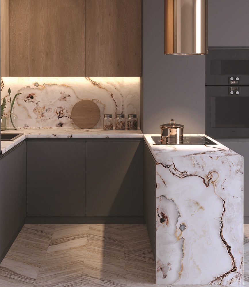 Столешница 3050x600x40 1U 8233 Оникс персидский //5 обладает влагостойким слоем, который обеспечивает надежную защиту от разбухания столешницы при частом контакте с водой, благодаря качественной герметизации. Столешницы устойчивы к различным бытовым химиям, чернилам, пищевым кислотам и ультрафиолетовому излучению, что сохраняет их внешний вид и функциональность. Также они обладают высокой стойкостью к механическим повреждениям, таким как царапины и сколы и выдерживают высокие температуры без образования следов от горячей посуды.